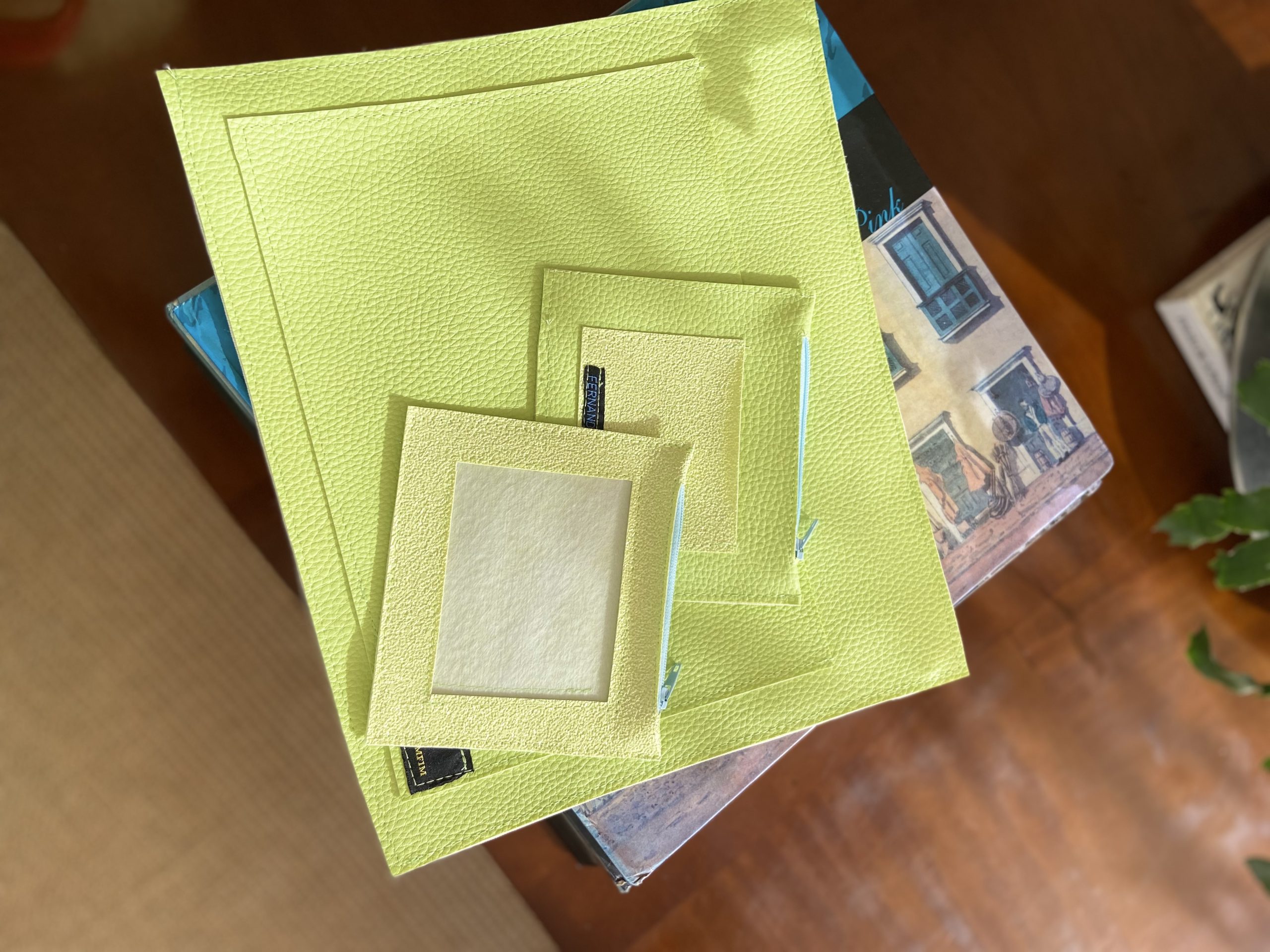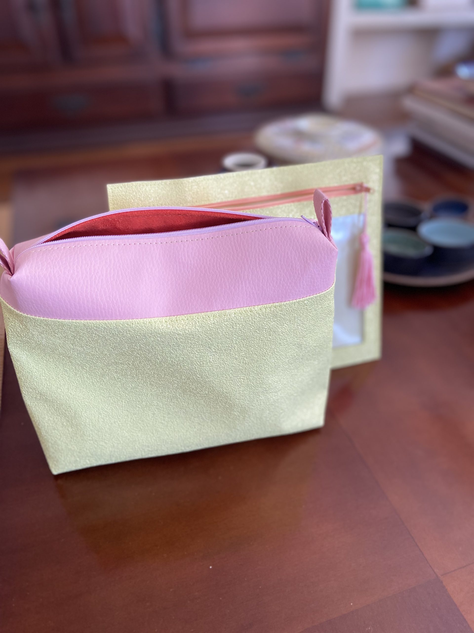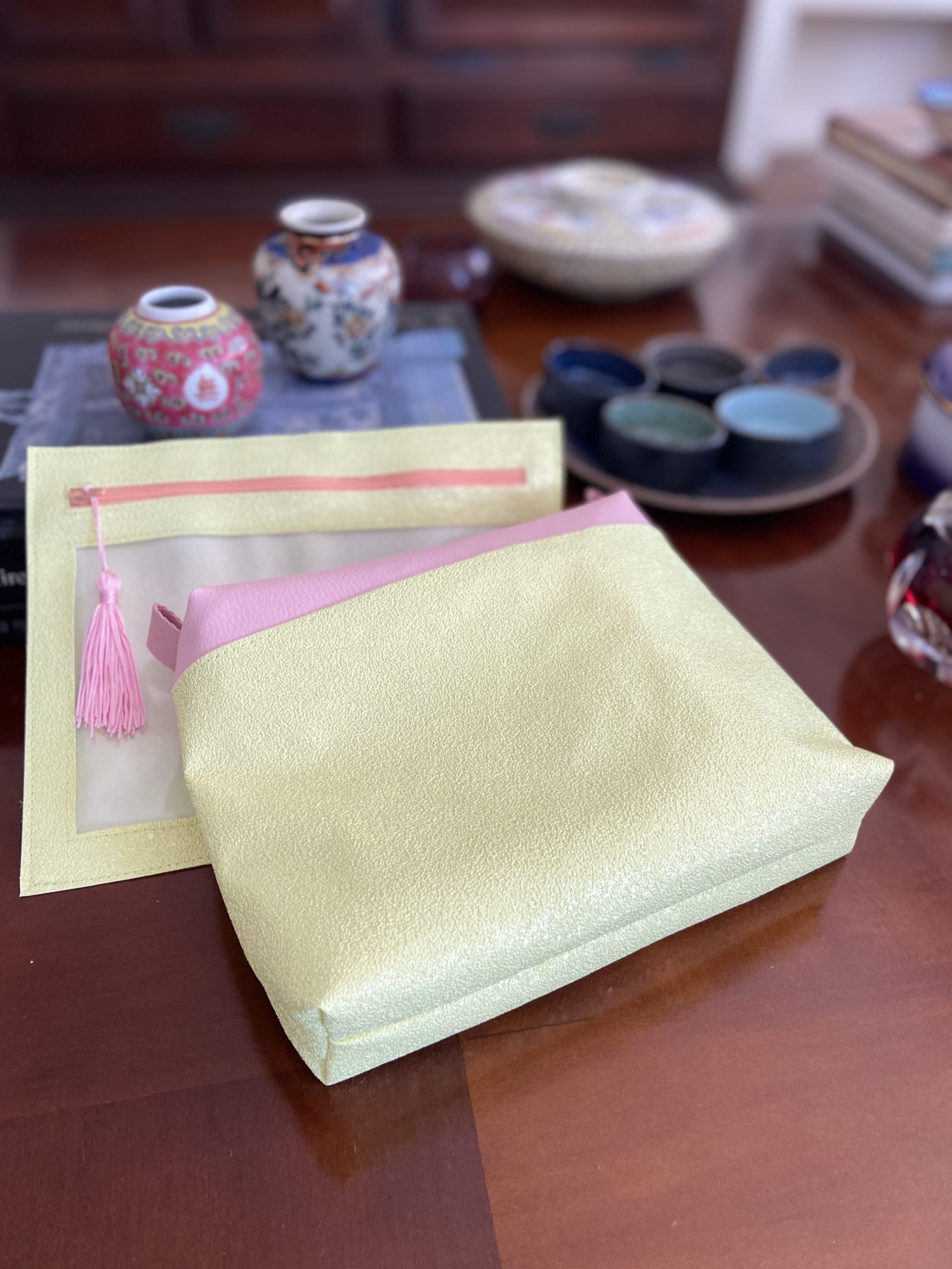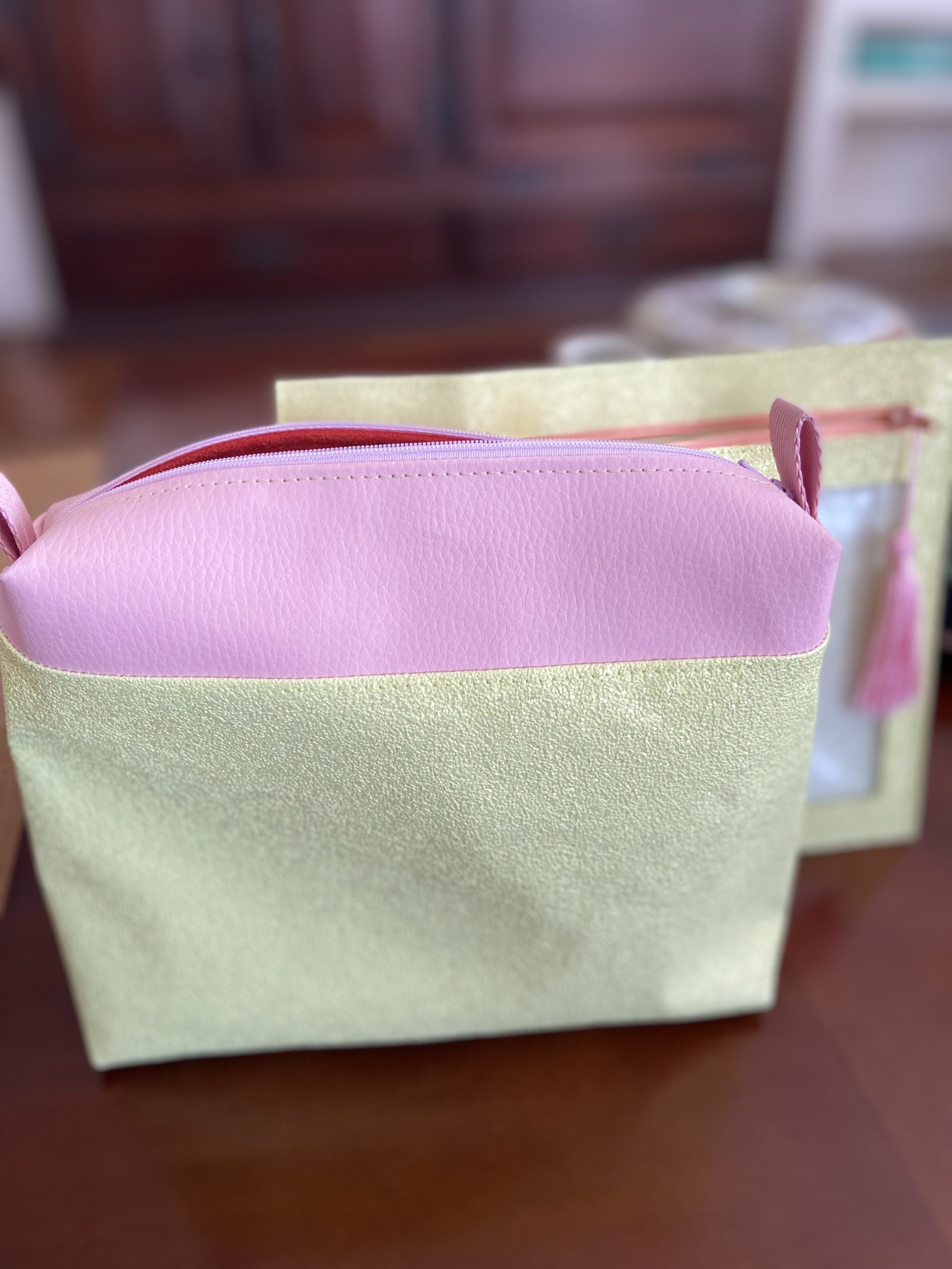 Necessaire amarela com brilho e detalhe rosa, e pastinha porta papéis amarelo