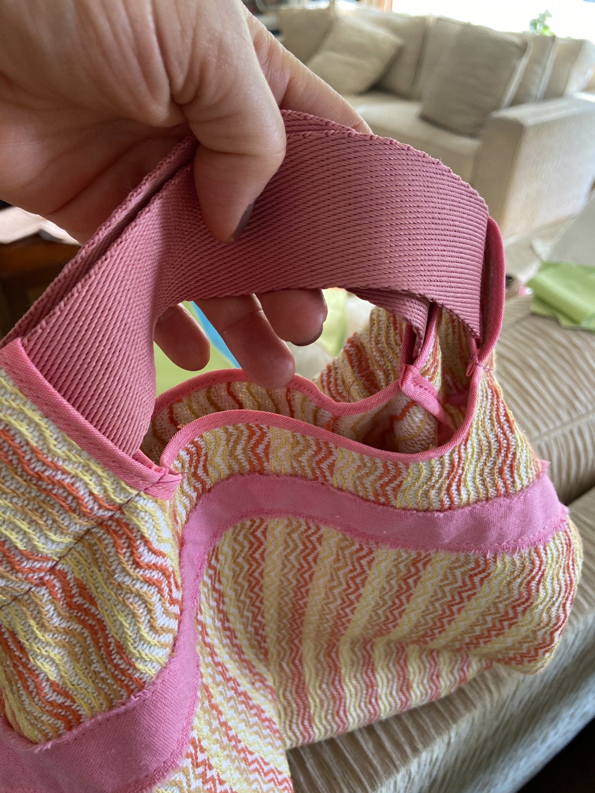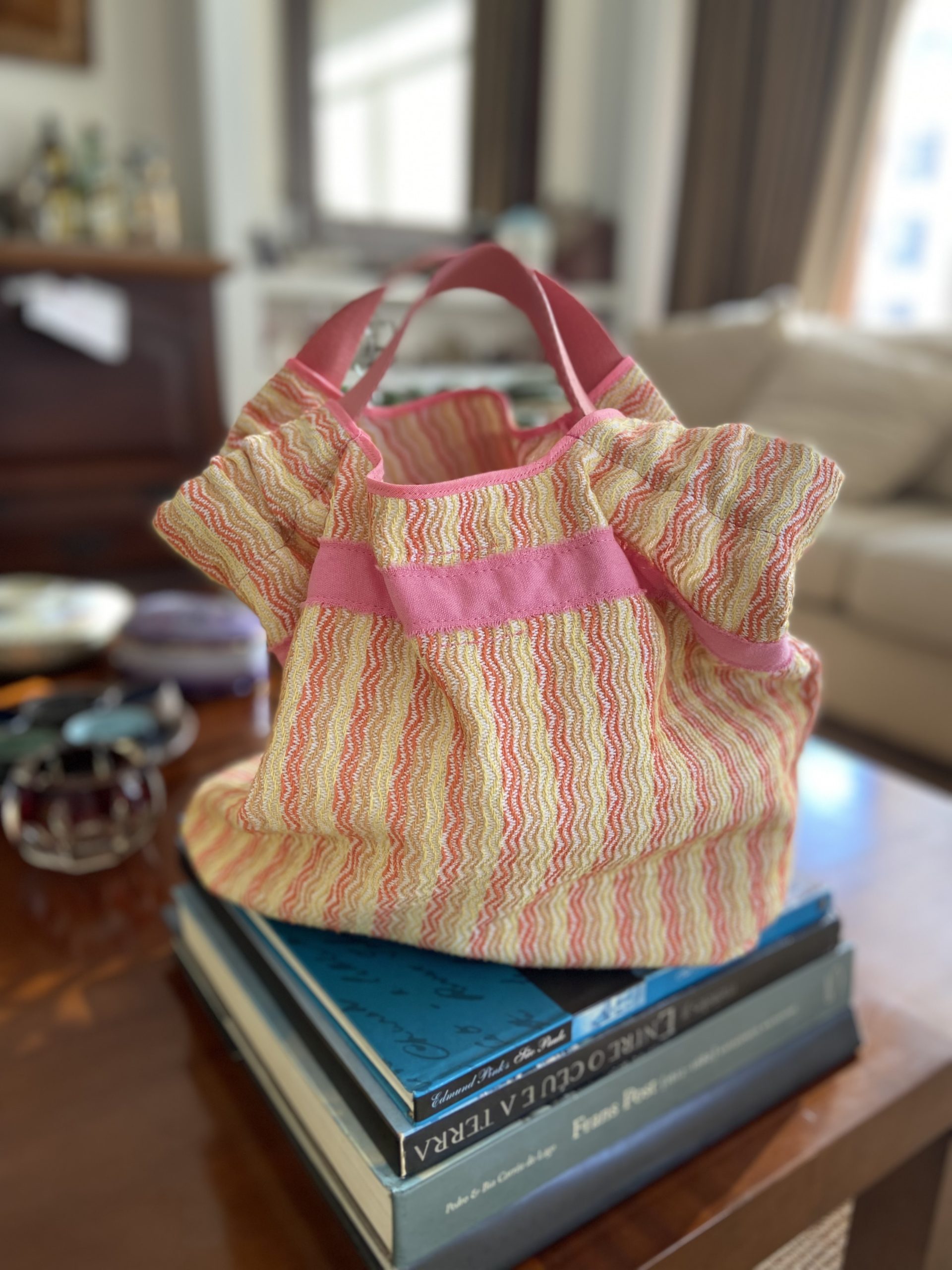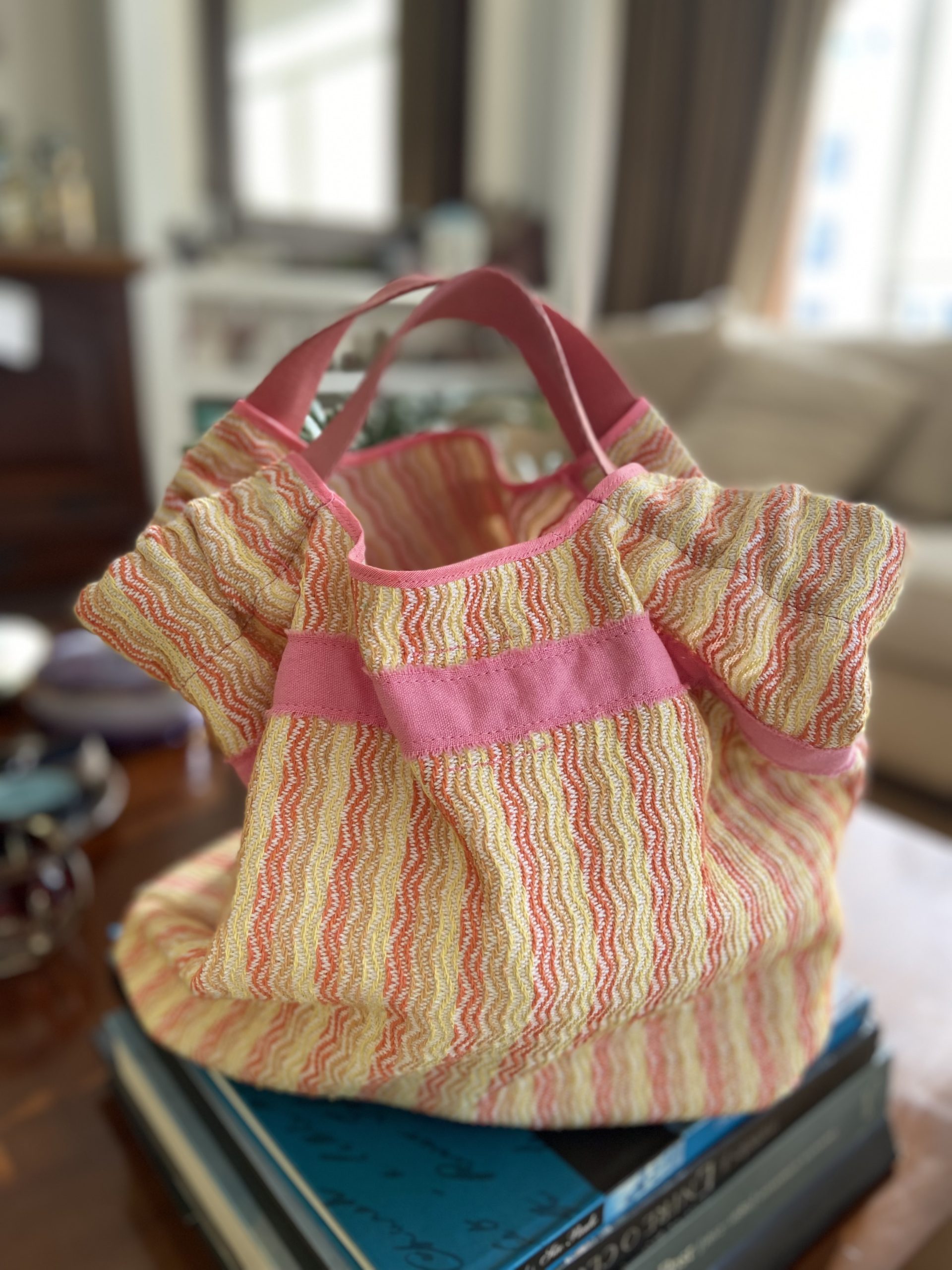 Bolsa com tecido estruturado de algodão rosa e detalhes amarelo e laranja
