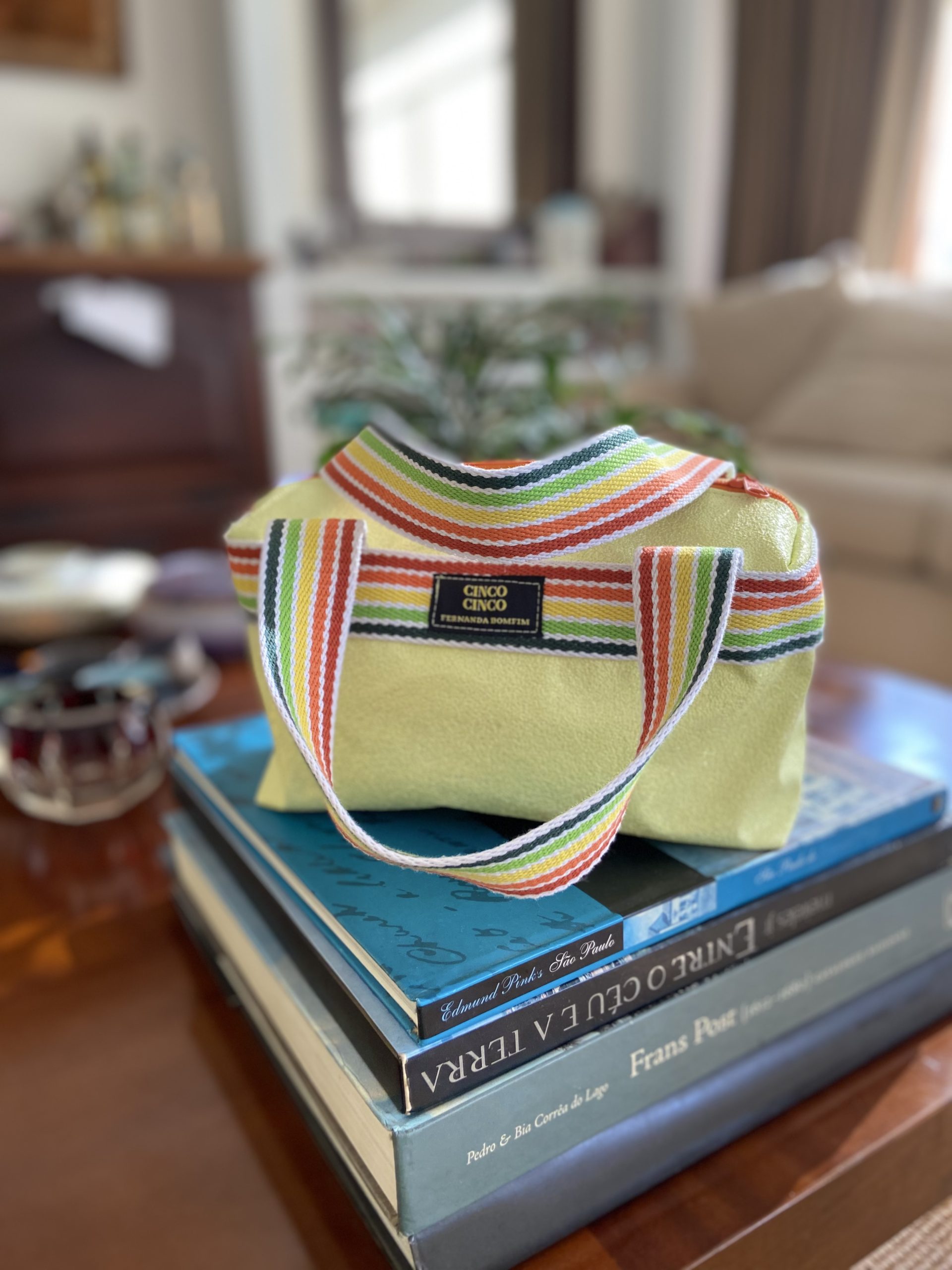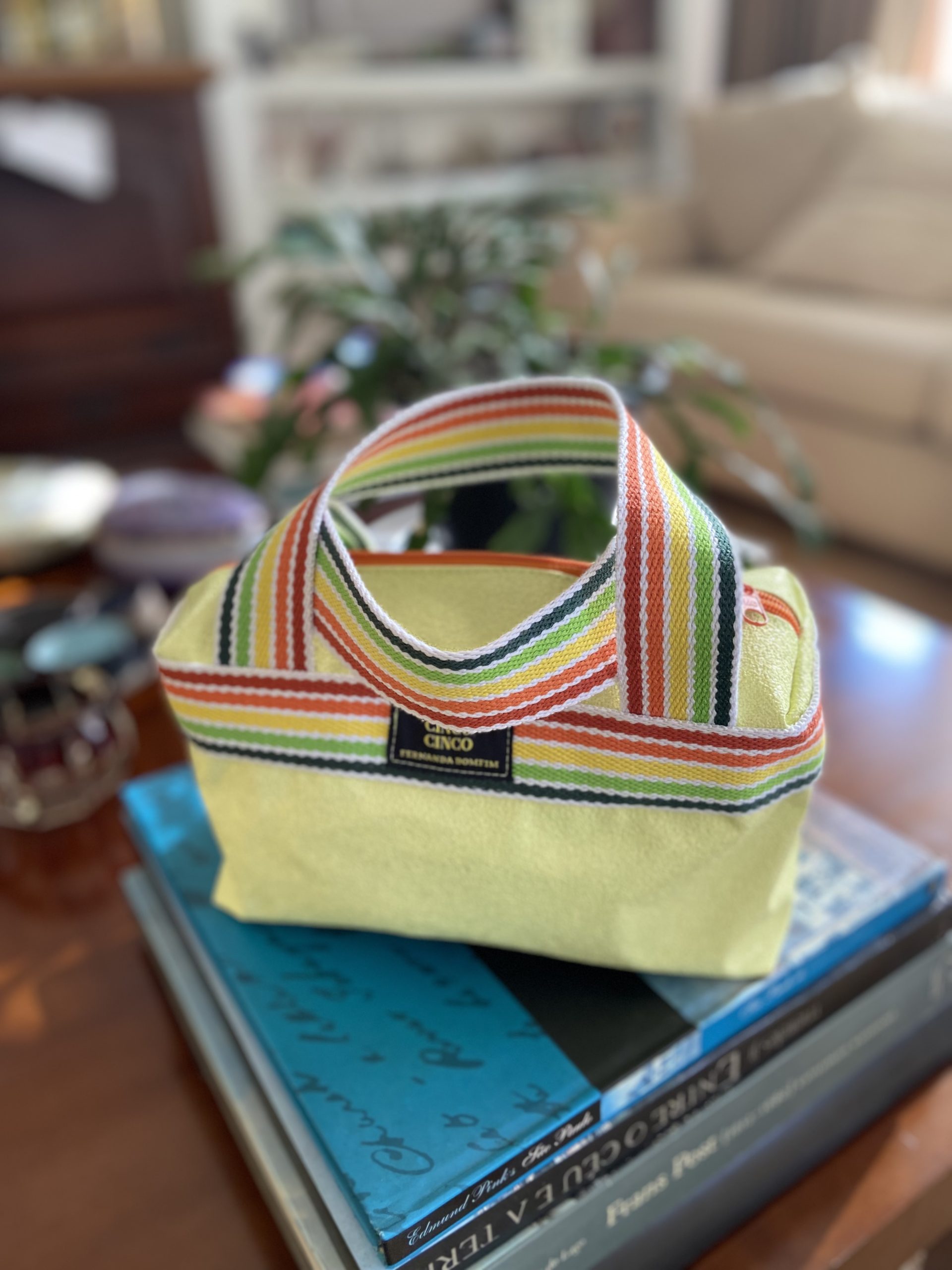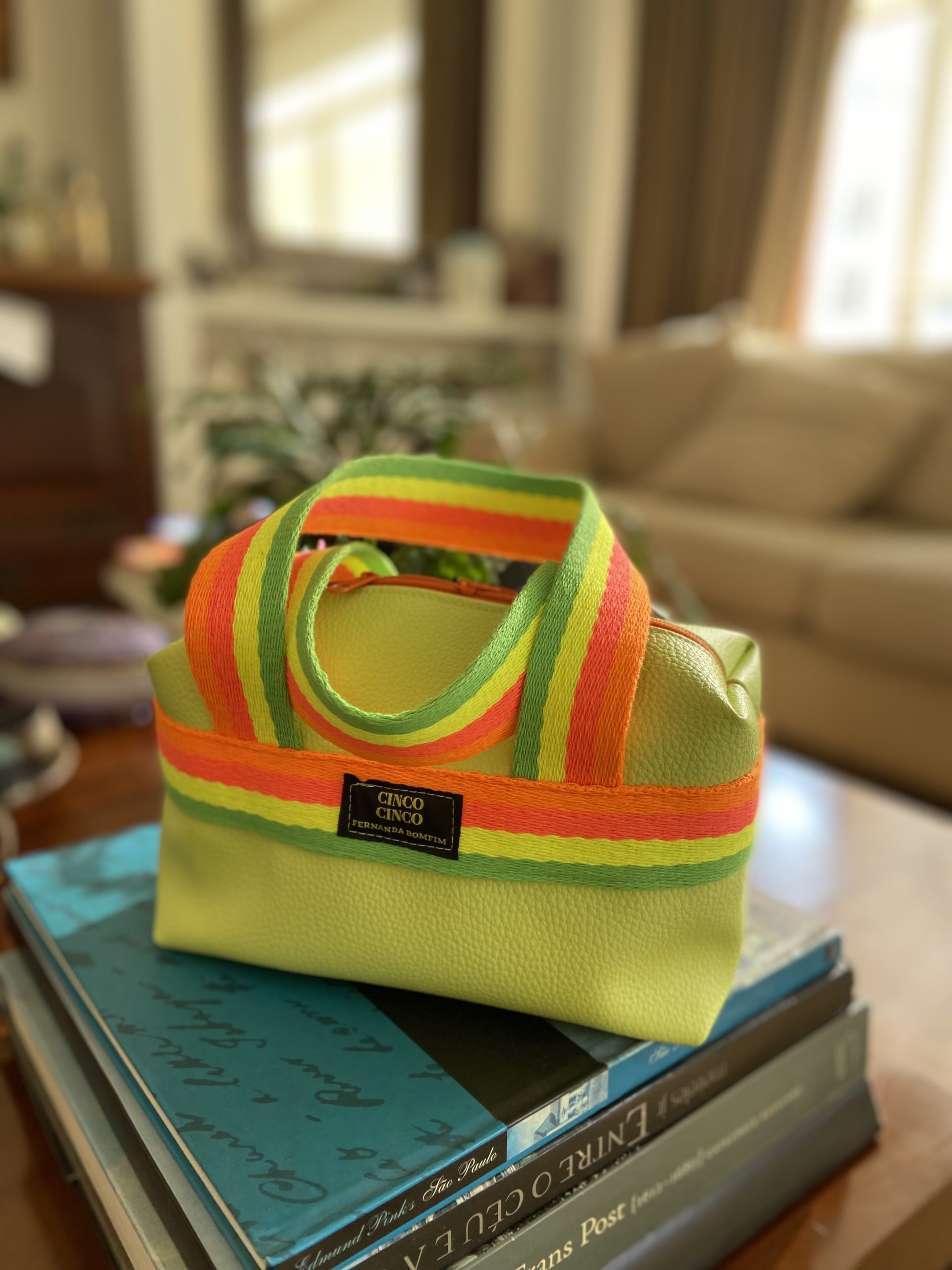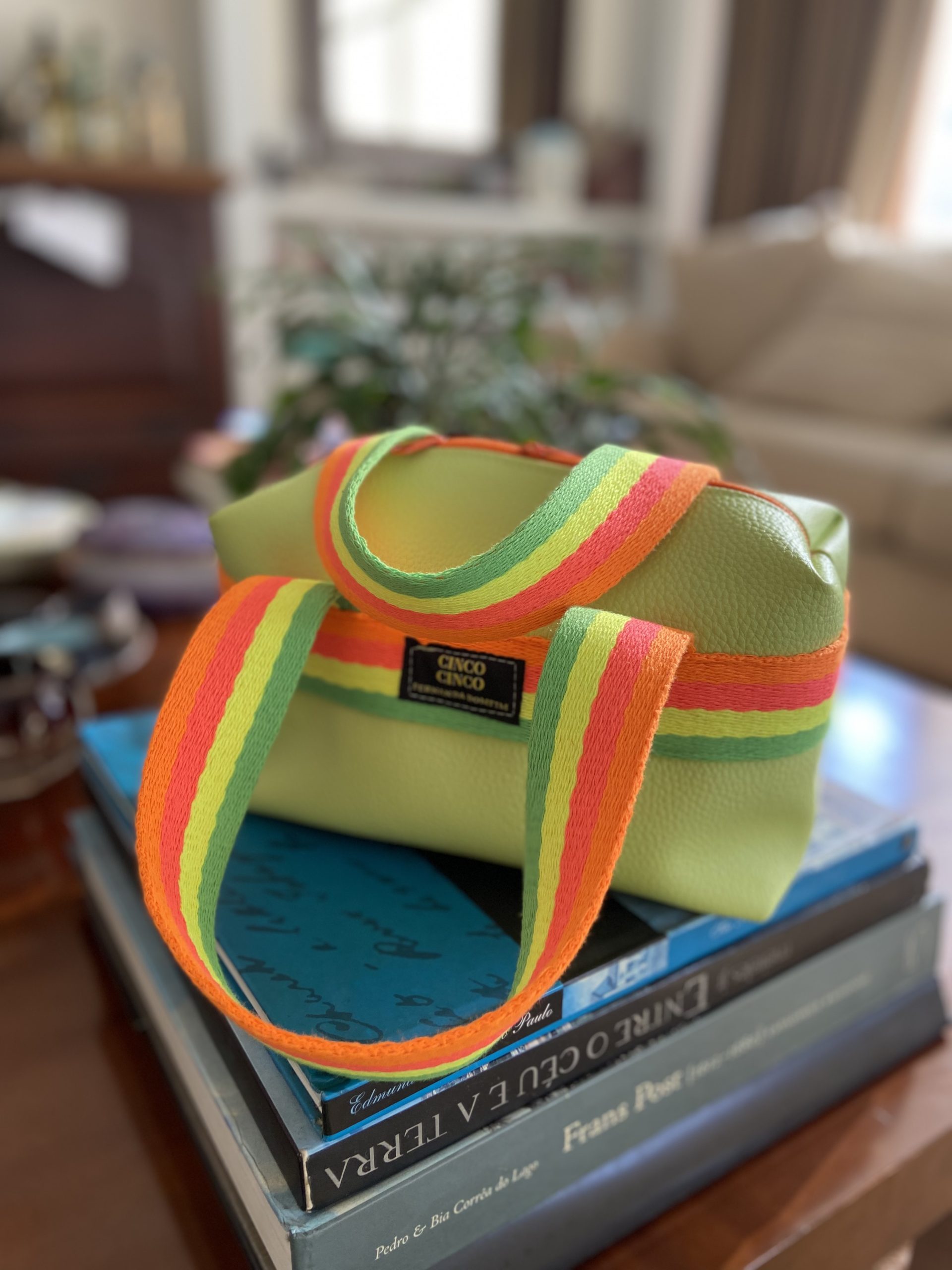 Necessaire amarela com alça colorida neon