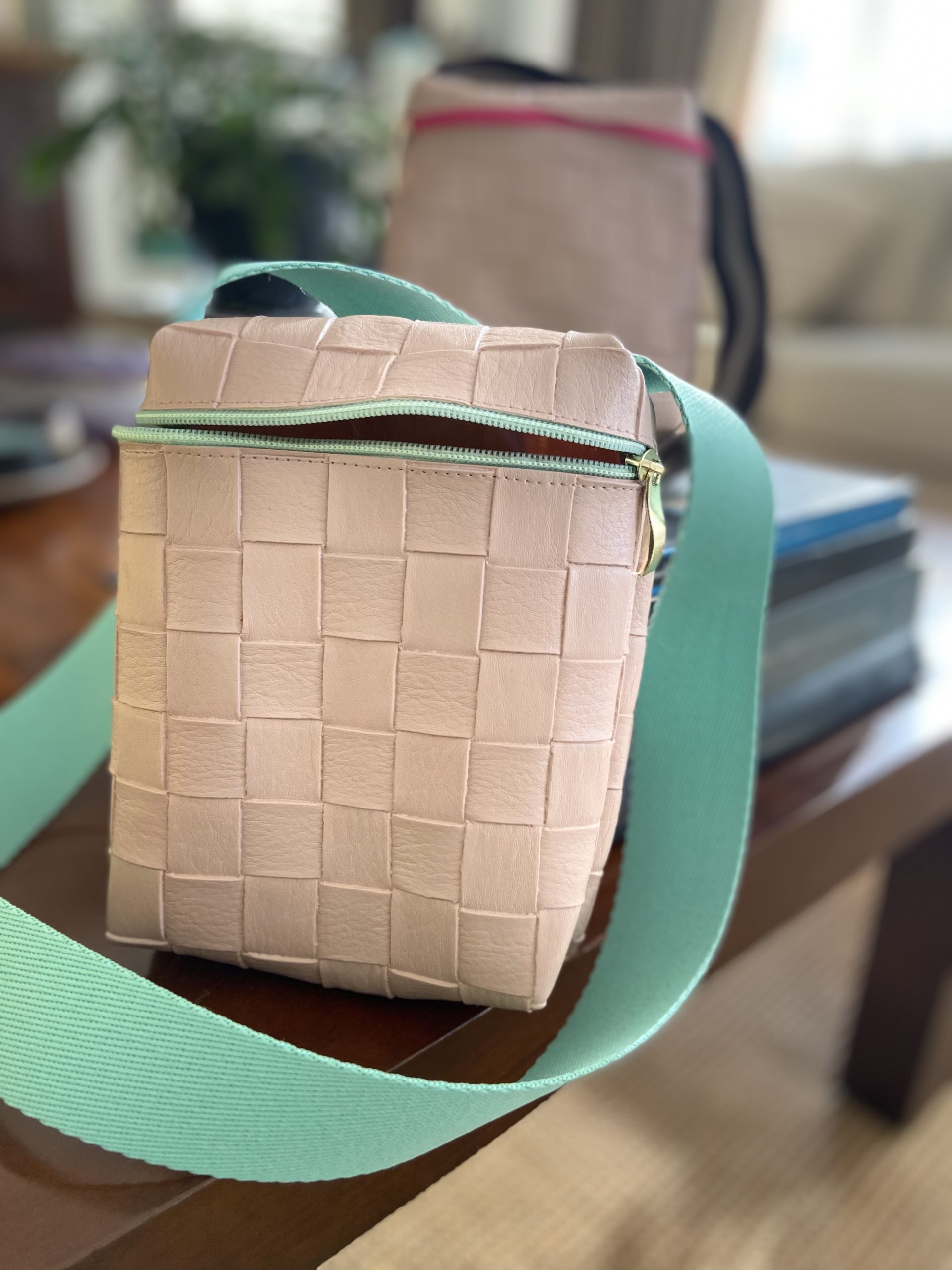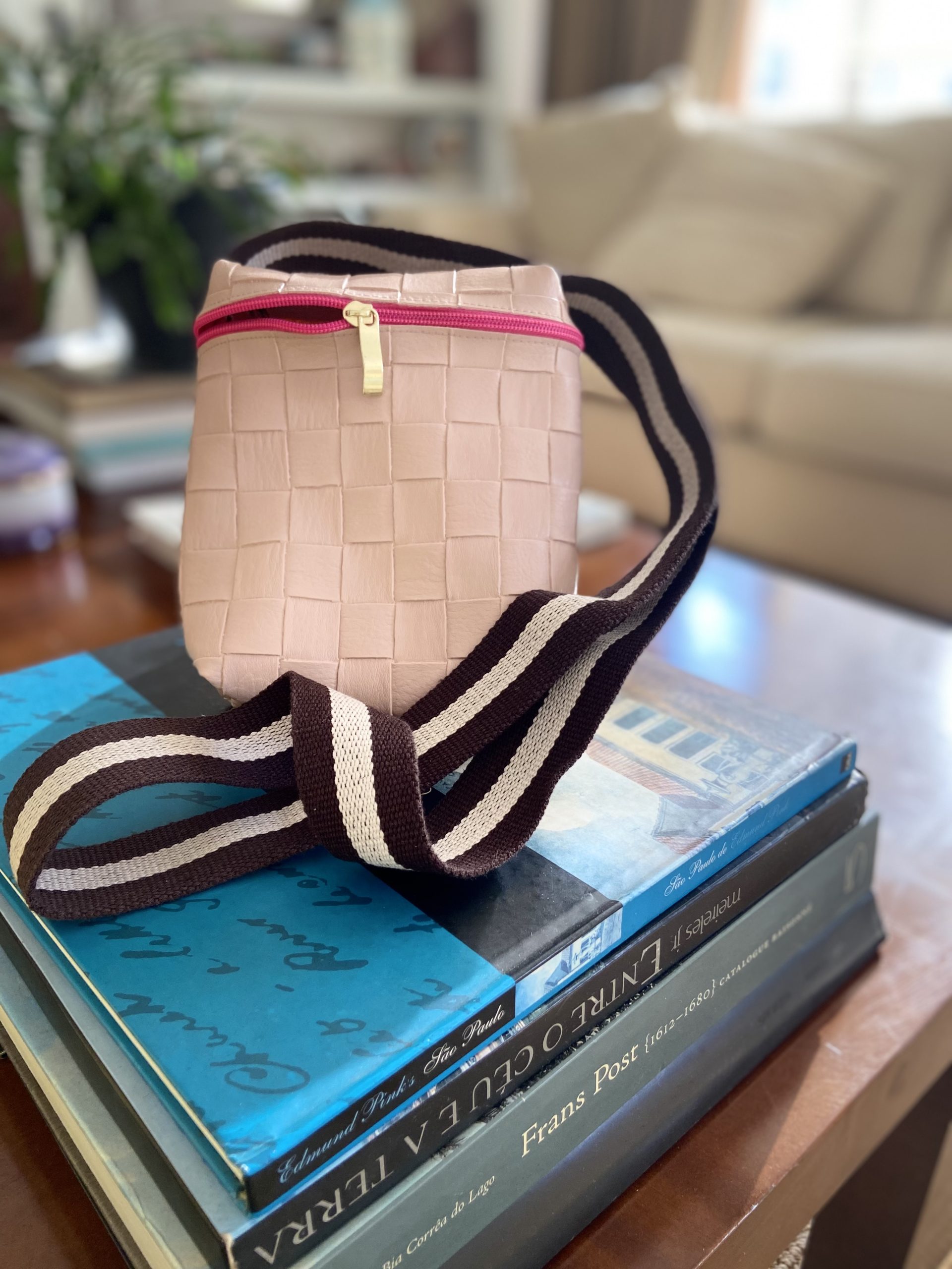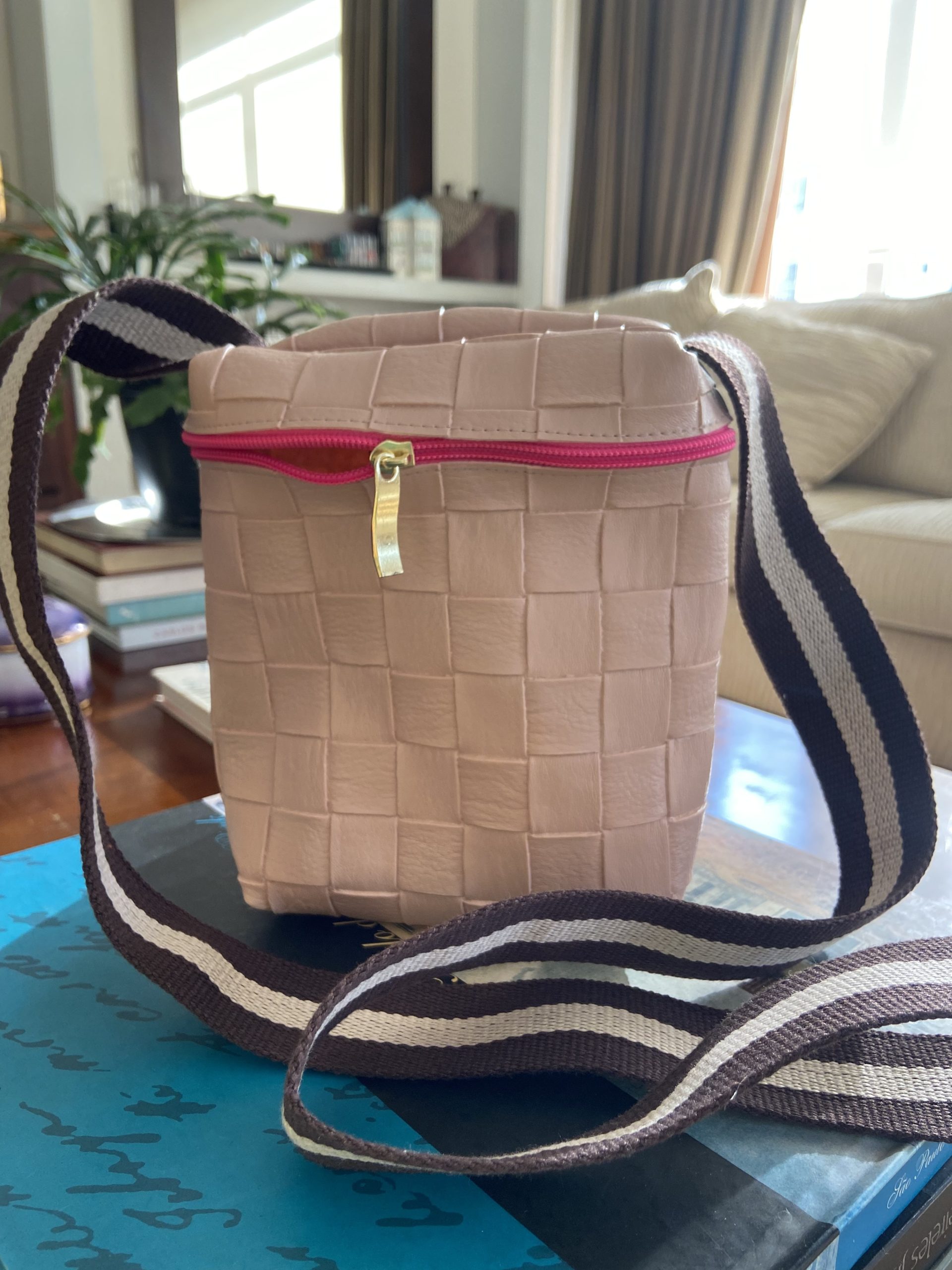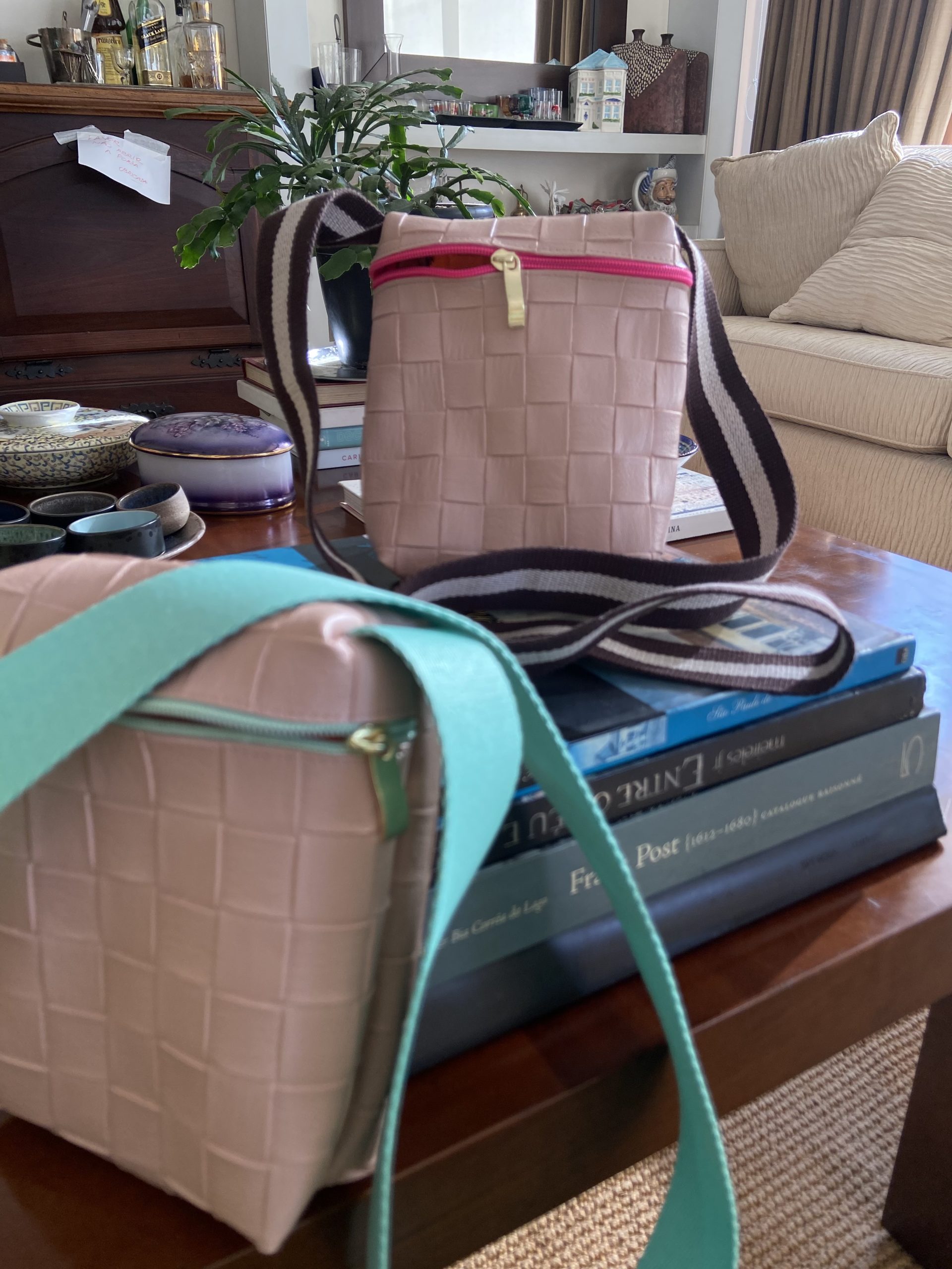 Bolsa transversal rosè e alça marrom e zíper pink.