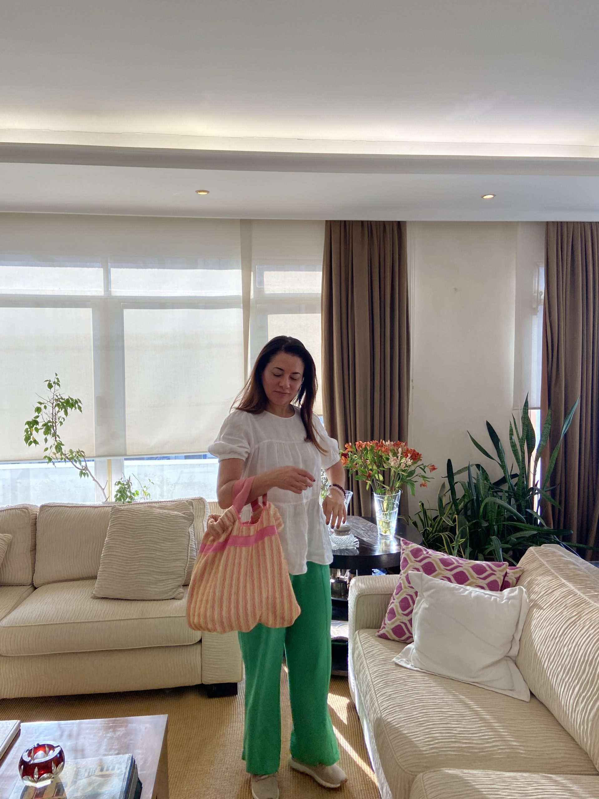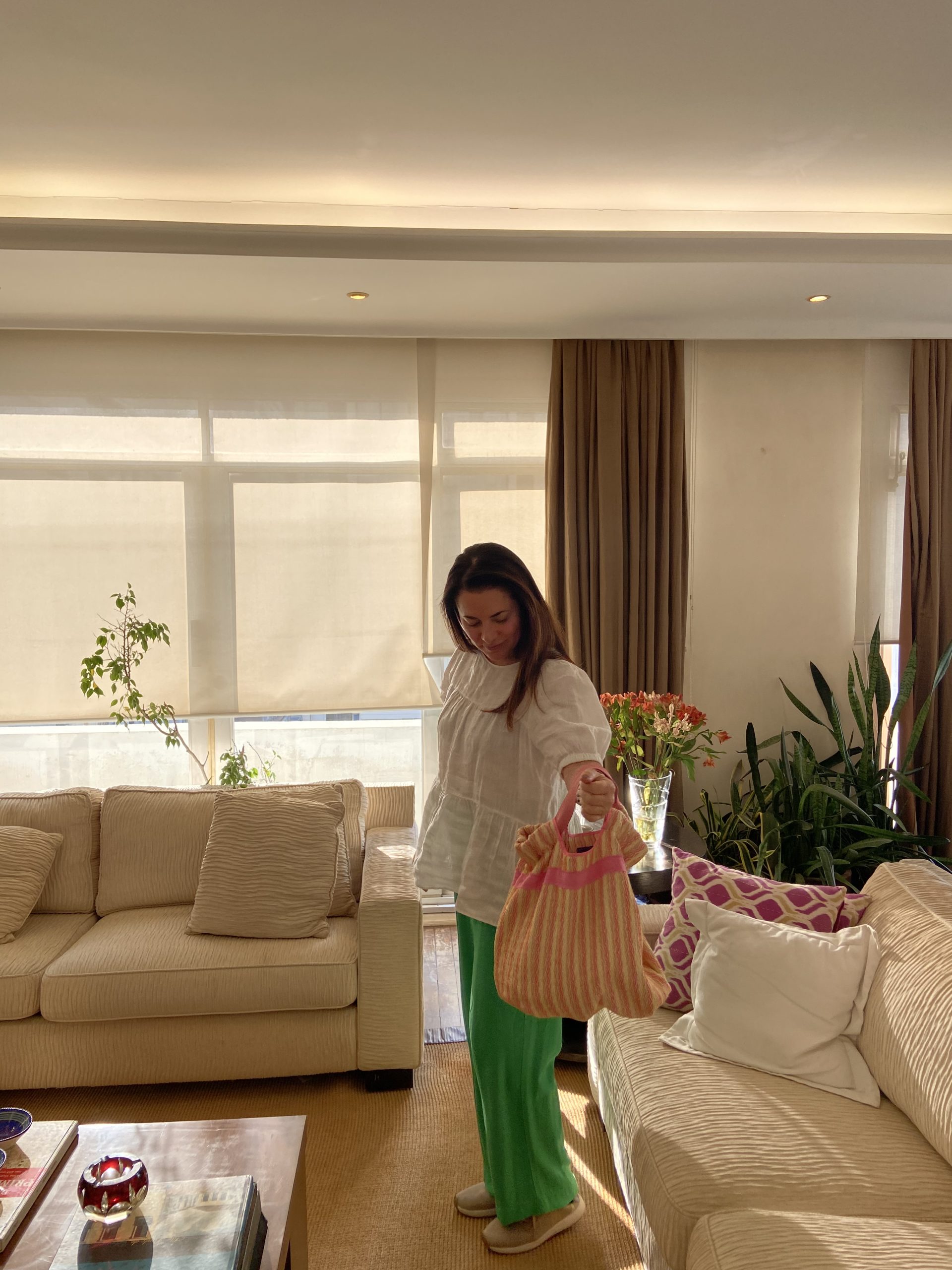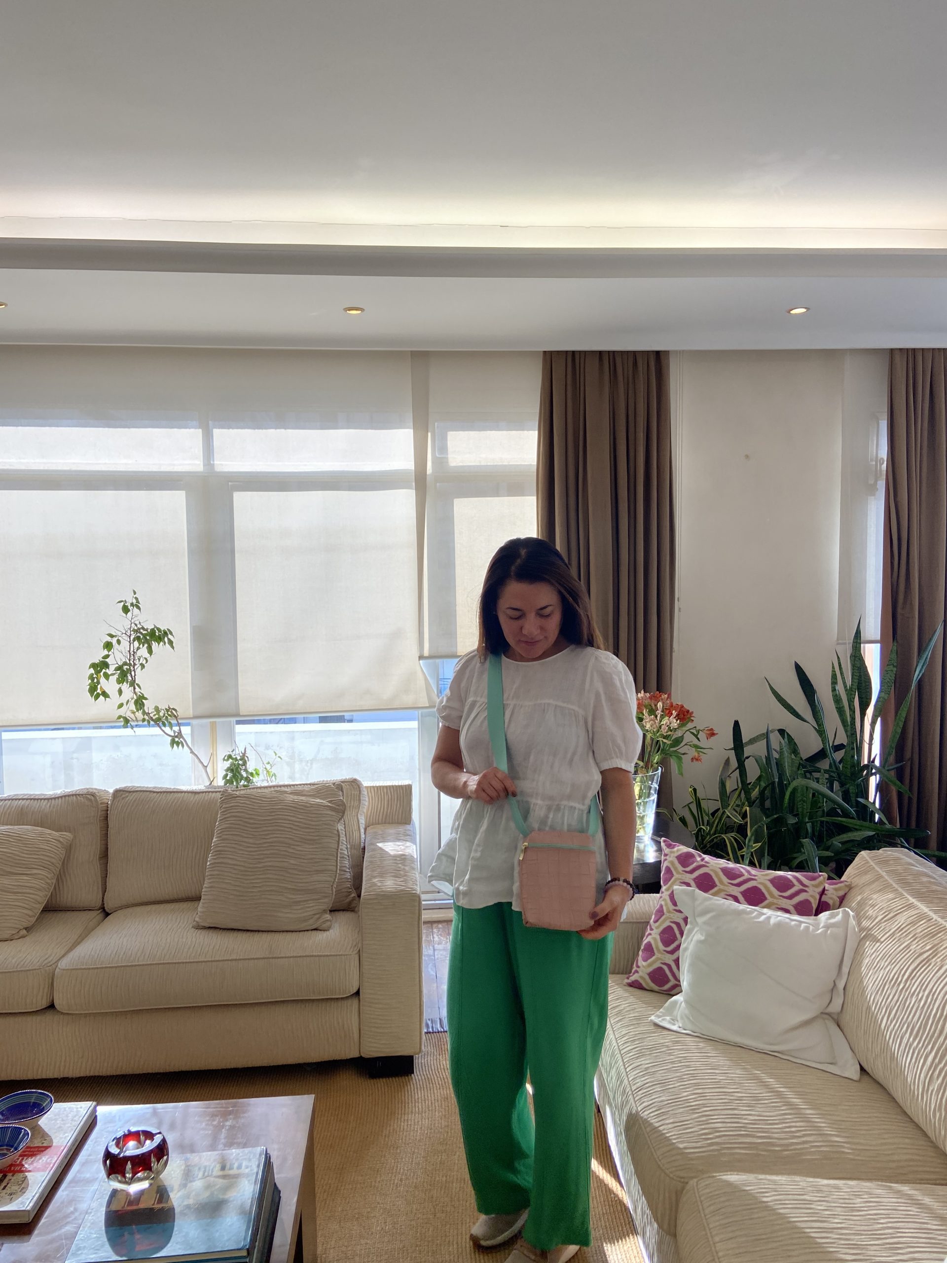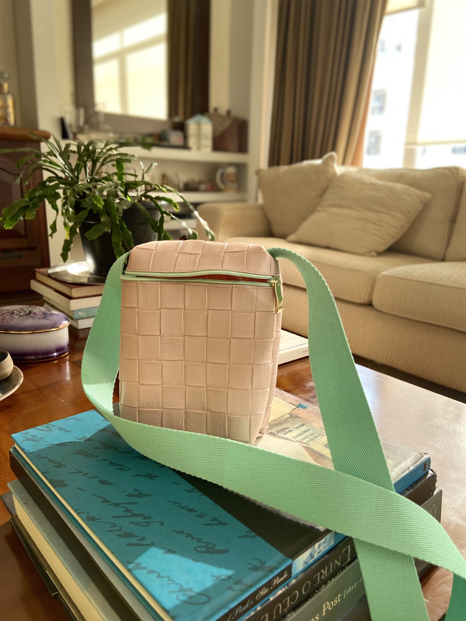 Bolsa transversal rosè e alça verde