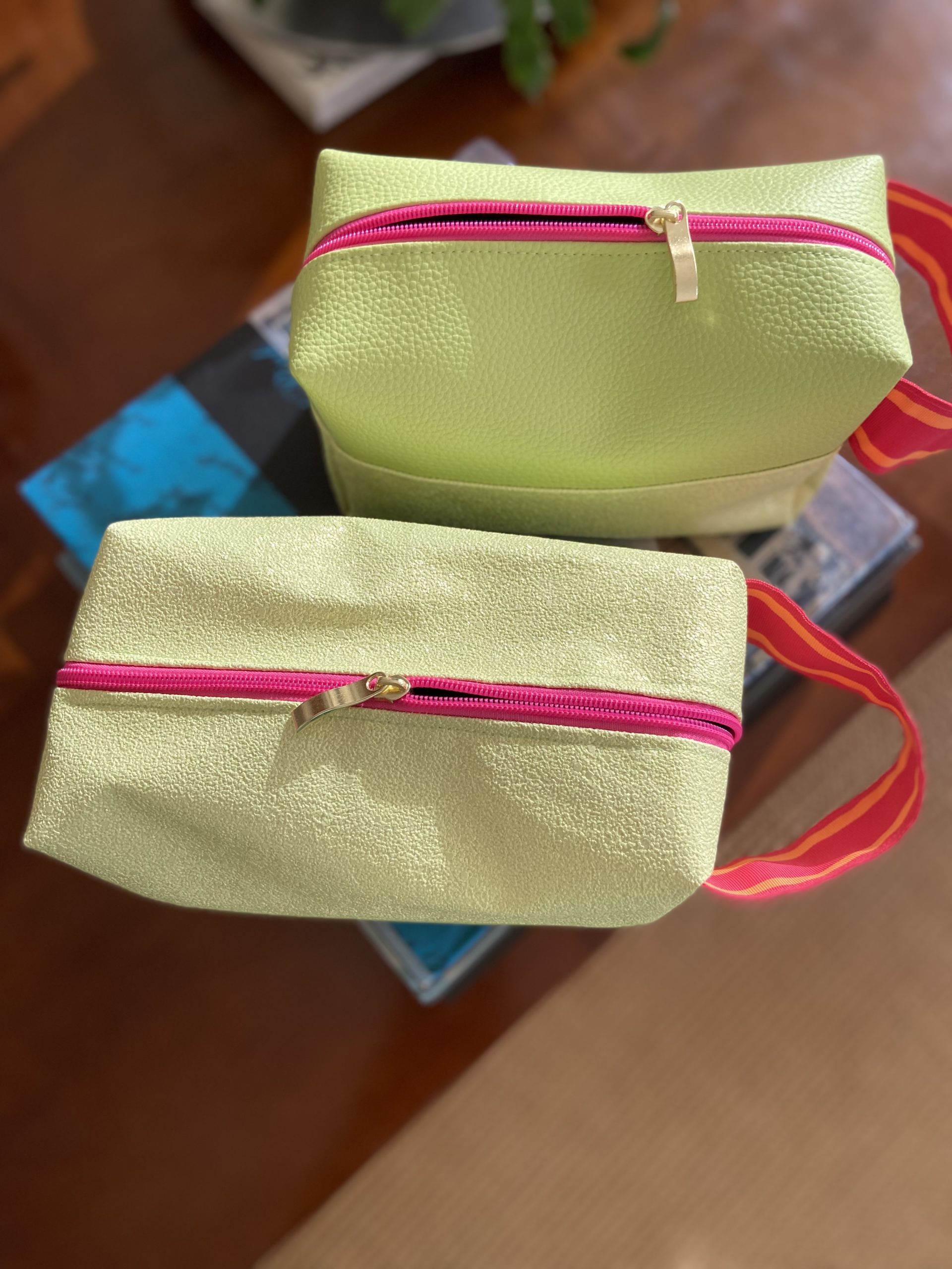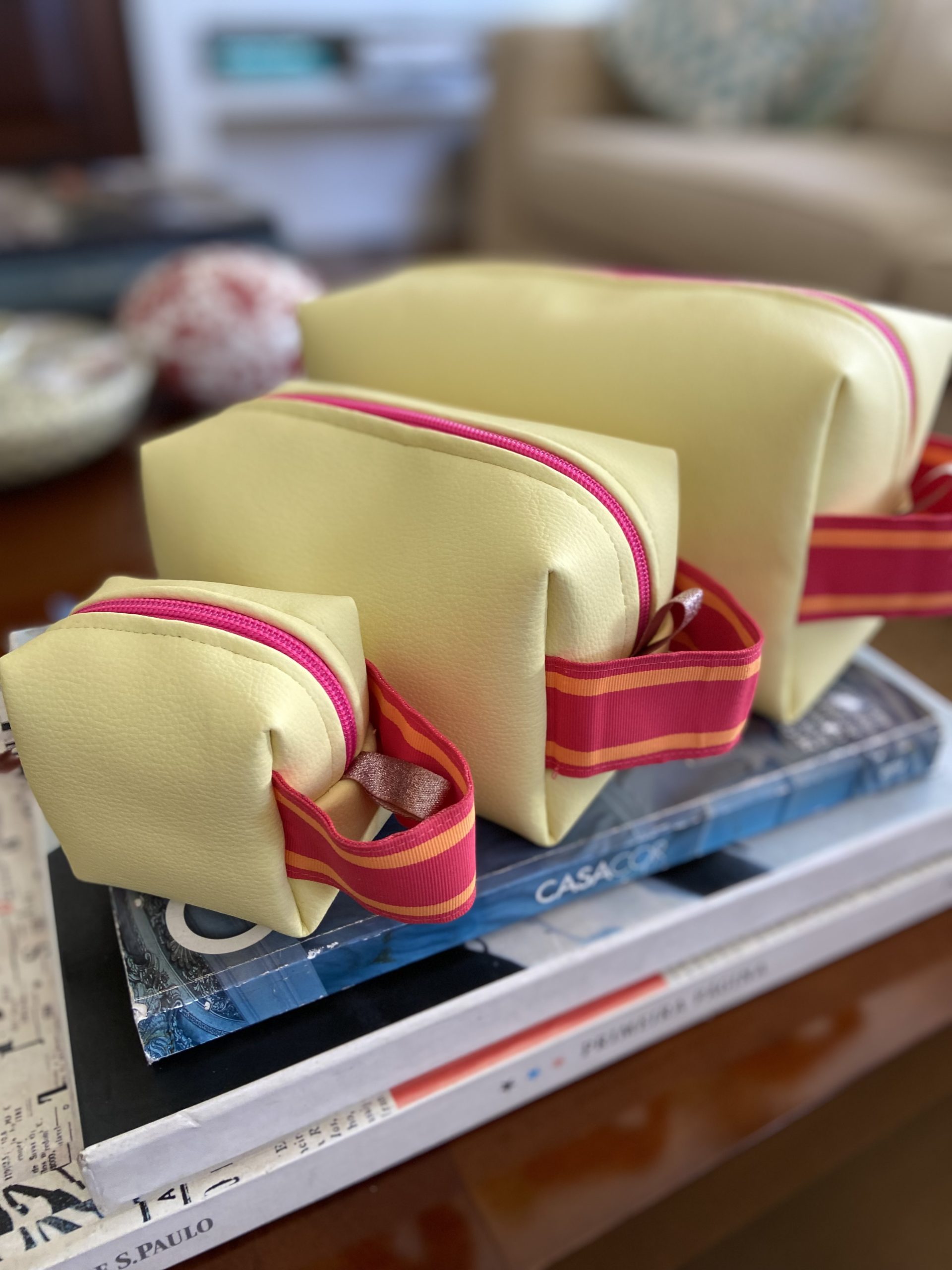 Necessaire amarela brilho, com alça rosa e laranja. 01 necessaire o detalhe brilho na parte superior e a outra necessaire na parte inferior.